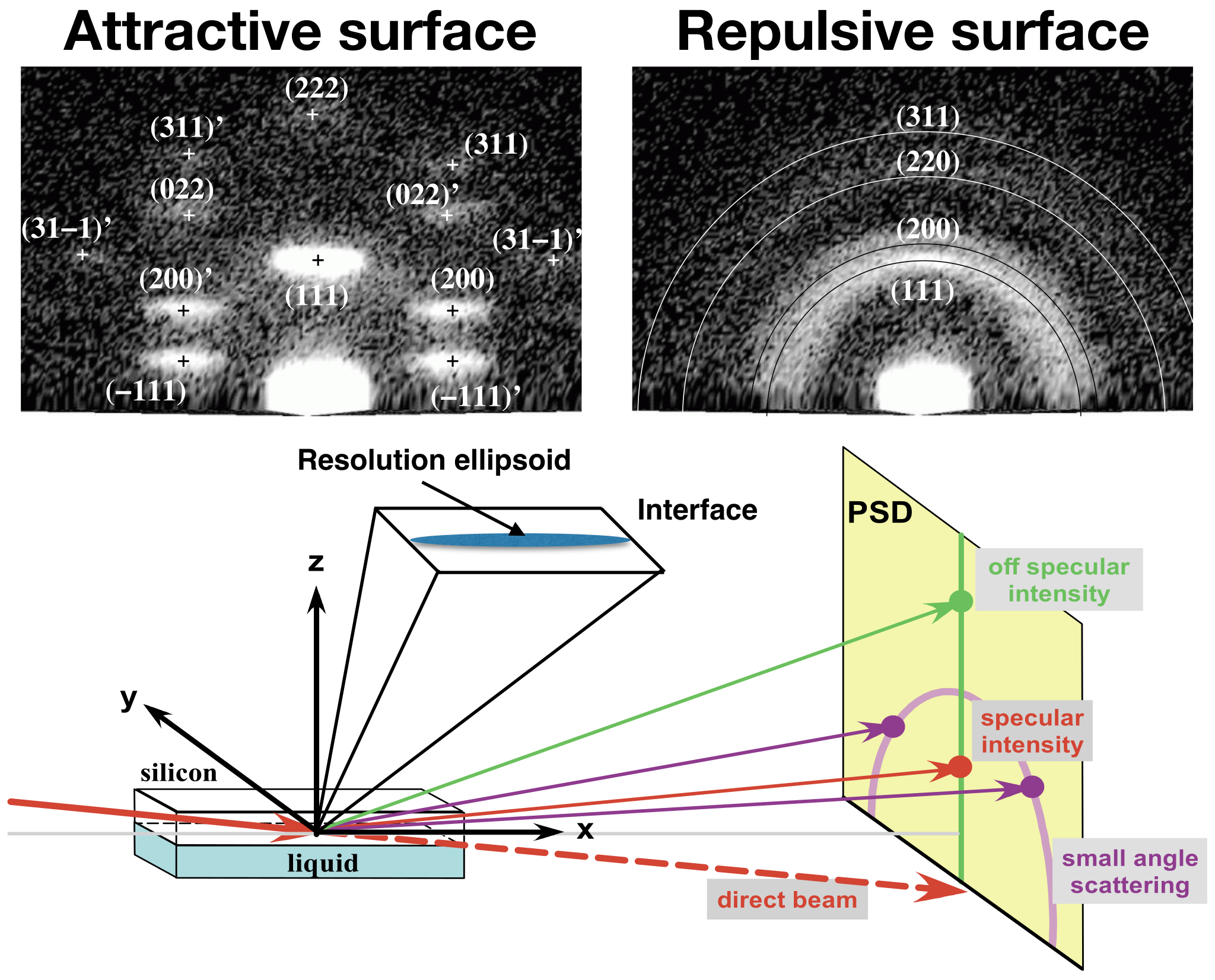 The GISANS method allows to resolve the structure of materials at interfaces in three dimensions (for an introduction see, e.g. M. Wolff: Grazing incidence scattering, EPJ Web of Conferences 188, 04002 (2018)). The scattering geometry is shown in the lower panel. A particular strength of neutrons is their large penetration for many materials and the ability to study solid-liquid interfaces. A neutron beam enters a thick silicon wafer from the side and gets scattered at the liquid interface (typically deuterated). The upper panel shows an example of the influence of surface energy on the self assembly of polymer micelles (balls of polymer). In bulk the micelles form a face centred cubic structure. The two scattering patterns clearly show, that this cubic structure develops strong texture (cubic dense packing) at an attractive interface, while a powder like structure is formed at a repulsive one (M. Wolff et al., Phys. Rev. Lett., 92, 255501 (2004)).